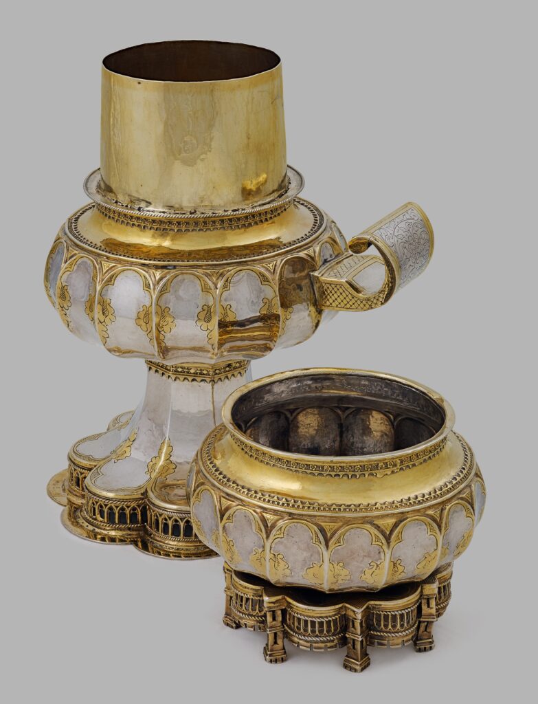Generell sind weltliche Silberobjekte aus gotischer Zeit selten im Original erhalten und uns häufig nur durch Bildquellen überliefert. Der spektakuläre Doppelpokal – in der Fachsprache auch Doppelscheuer oder Doppelkopf genannt – ist rund 30 Zentimeter hoch und setzt sich aus vier Einzelteilen zusammen: