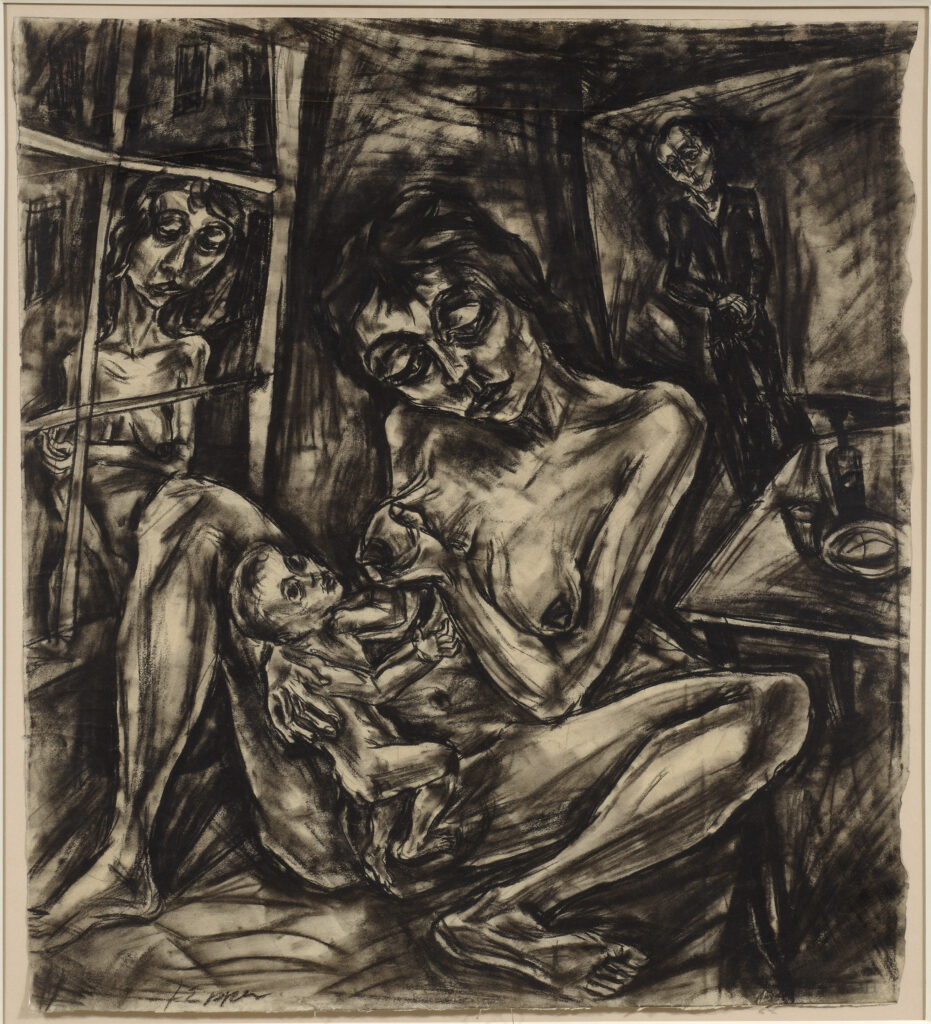 Sanft-melancholische Zweisamkeit lässt sich wiederum beim „Paar im Café» erkennen, das sich, zwei kleine Tässchen in der Hand, einander zuwendet. Das typische Motiv der stillenden Mutter – hier auch an eine Maria lactans erinnernd in der Art, wie sie dem Kind die Brust reicht – zeugt ebenfalls von Zuwendung. Doch liegt dem Bild eine intensive Trauer inne: die nackte Mutter und ihr Kind erscheinen grosser Kälte ausgesetzt, im Hintergrund blickt ein trauriger Mann auf das Mutter-Kind-Paar. Ausgeschlossen vor dem Fenster steht eine Frau, die ihre offenbar muttermilchpralle Brust, die sie mit ihrer Hand stützt, ihrem Kind nicht anbieten kann – ob sie es verloren hat?